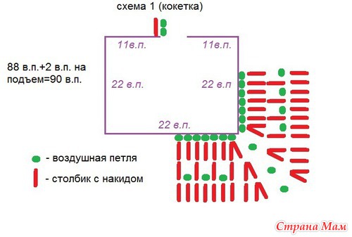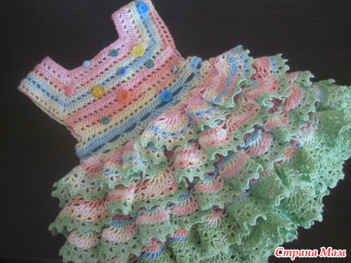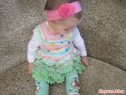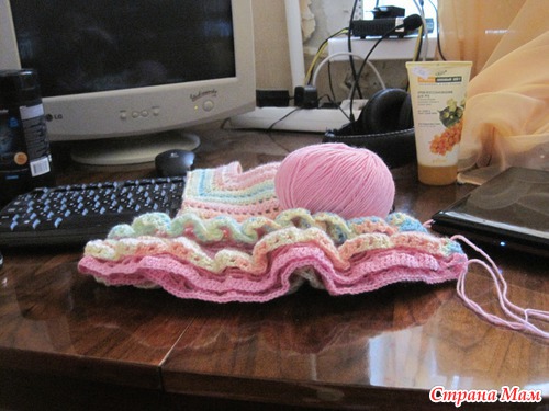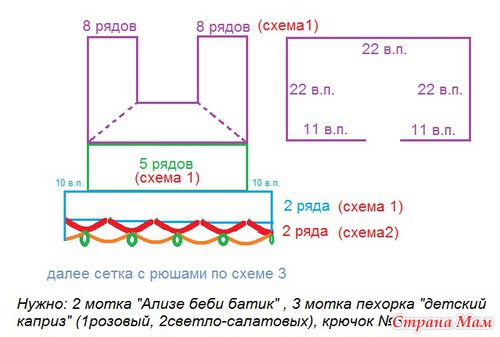 Добрый!!! Исходные данные: пряжа "Ализе беби батик" (2 мотка), пехорка "деткий каприз" (1розовый- на сетку, 2 светло-салатовых мотка на рюши), крючок №3 (мне потребовалось 2 штуки, т. к. один в процессе сломала), доча 1год и 2мес.