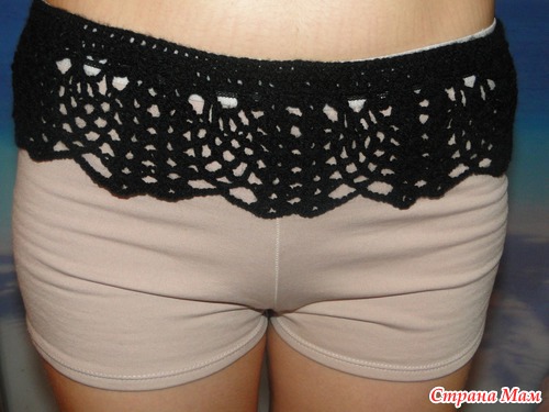 Вообщем, отчитываюсь. Поигралась я с этой разнесчастной полосочкой и поняла, что она должна быть широкая, чтобы было комфортно. А наиболее приемлемая форма для меня - форма трапеции. Широкое основание спереди, постепенно сужается к задней части шорт. Не впивается, при ходьбе не мешает. У меня получилось в основании 13 петель, в самом конце их количество сократилось до 7. Может, это конечно и неправильно, и не по стандартам, но удобство для меня это главное. В общем, смотрите, что вышло.