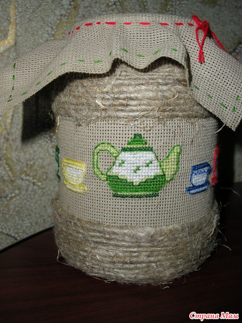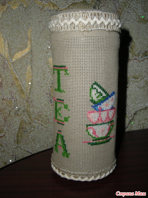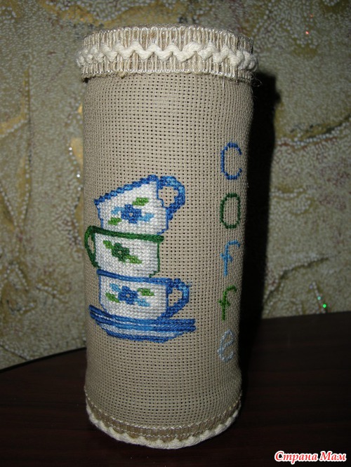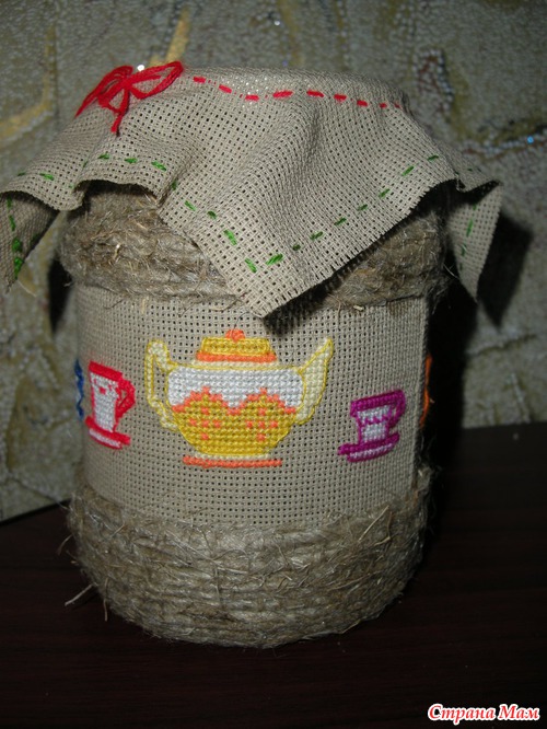 Берем ткань для вышивки,меряем по баночке.отрезаем.берем рисунок который вам нужен и вышиваем его посередине ткани,надписи по бокам.Крышку обплеиваю той же тканью,а по кругу приклеиваю тесьму.Внизу тесьма пришита к ткани,а потом подклеена к дну банки.