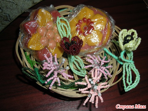 Это два мыльца, оформленные цветочками из бисера. Еще потом чуть подправлю оформление.