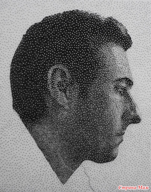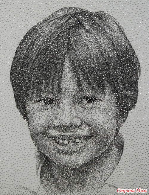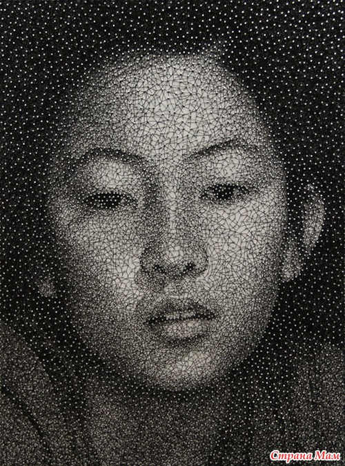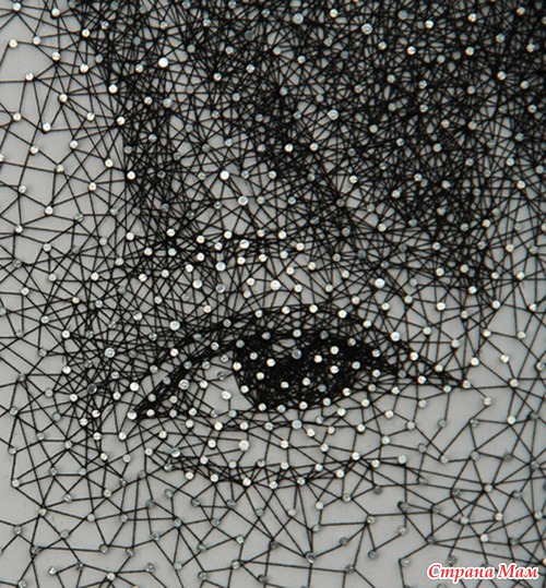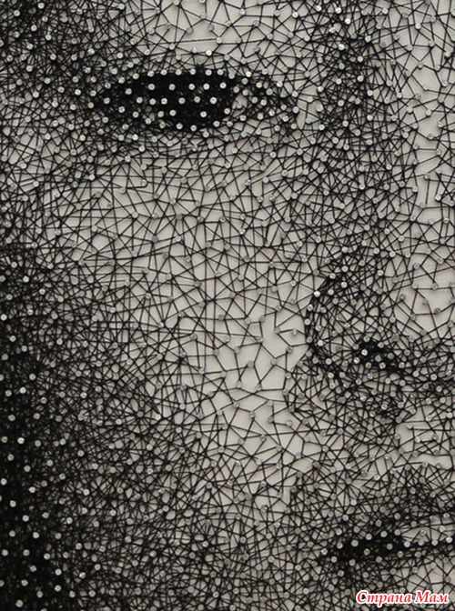 Это американский художник из Японии Куми Ямашита (Kumi Yamashita). Перед вами довольно реалистичные портреты, для создания которых Куми использовала только светлую деревянную поверхность, гвозди и темную нить. Весь рисунок передаются направлением и плотностью натянутой на гвозди нити. Обратите внимание, что нигде не видно узелков – Куни использовала одну целую нить для всего изображения.