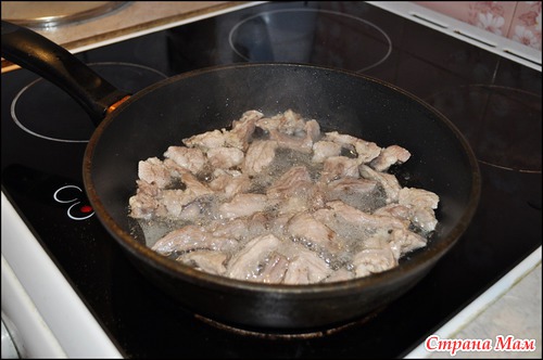 Свинину нарезаем соломкой, солим, перчим и тушим.