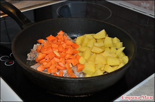 Добавляем мелко порезанный картофель и морковь, немного подсаливаем.