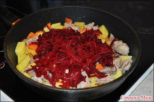 Все перемешиваем, тушим минут пять. Затем добавляем свеклу, потертой на крупной терке.