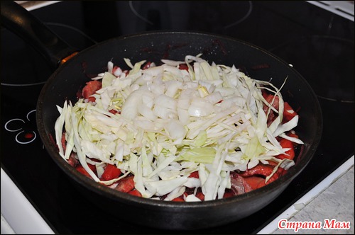 Все перемешиваем, подливаем еще немного водички, тушим пару минуток и добавляем капусту и лук.