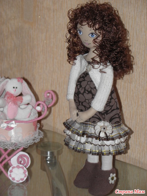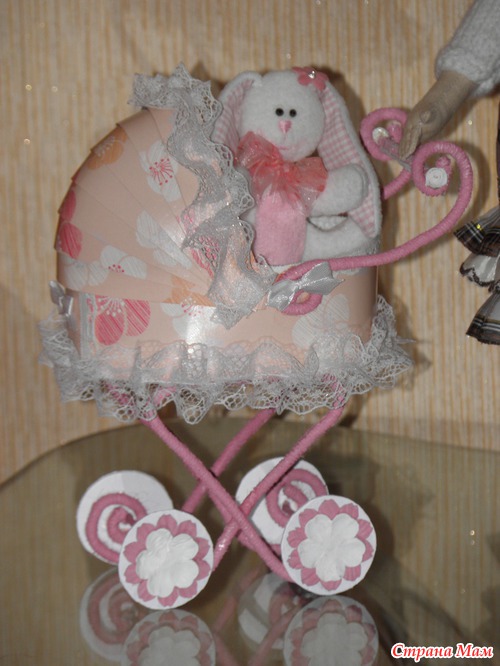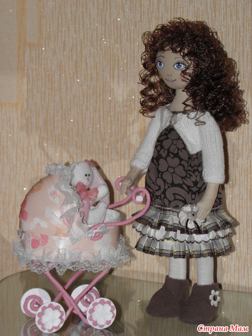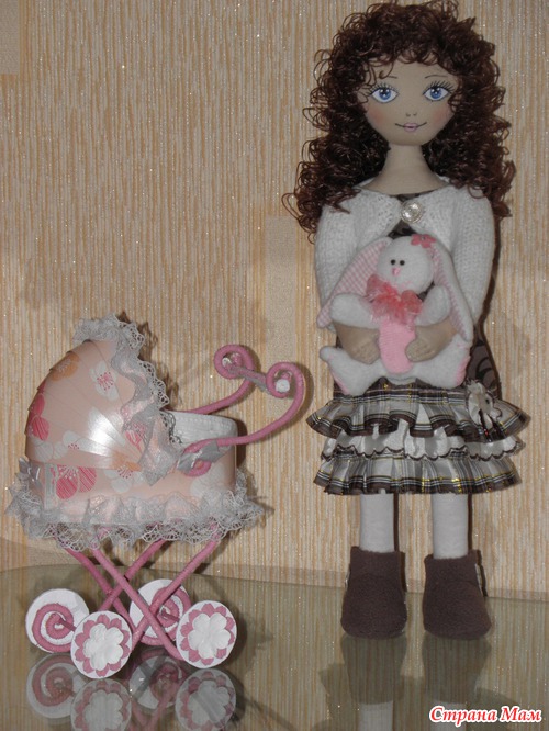 Она очень долго ждала свое маленькое чудо, и наконец-то свершилось! Скоро у нее будет малыш! Уже все готово к встрече и коляска конечно же тоже :-) Рост 32 см, коляска -18 см, зайка -8 см. Материалы :хлопок, флис, шерстяные нитки, коляска из картона, зайка из флиса.