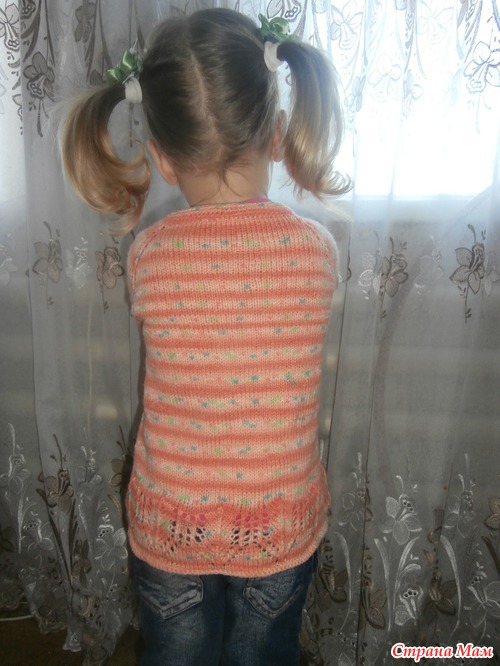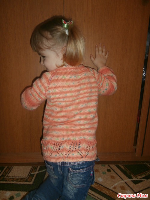Заказала по интернету нитки крейзи беби, правда заказывала желтого цвета, но пришли такие. Узор лег так, как надо только на рукавах, может потому что регланом вязала. Но дочке все понравилось, утром увидела и сказала :"Мама молодец". ниток ушло около 180 грамм.
