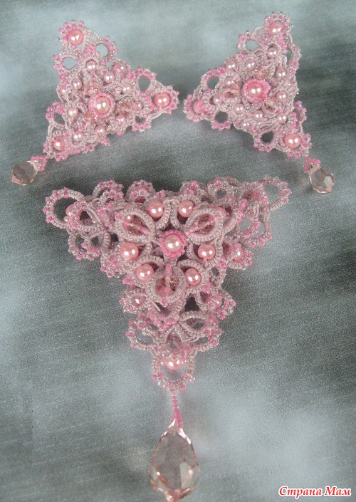 Гарнитур ВЫПОЛНЕН ТОЛЬКО В ОДНОМ ЭКЗЕМПЛЯРЕ. состоит из броши и серьг. Цвет нежно розовый. Материал : Нить капроновая, люрекс, бисер № 15 (япония), бисер №10 (чех), бусины (чешские по жемчуг и Сваровских (хрусталь)), подвески (чешские Сваровских (хрусталь)). Размер: брошь - шир. 6,5 см на дл. 8 см; серьги - шир. 4,0 см на дл. 5 см.