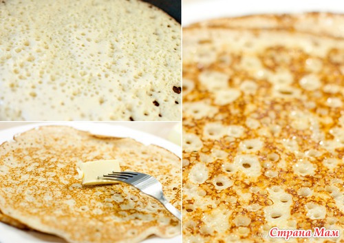 Сковородка должна быть очень горячей, а огонь под ней — довольно сильным. Остальное — дело техники. Фокус лишь в том, чтобы максимально распределить тесто по поверхности сковородки. Конечно, тоненькими такие блины в любом случае не получатся, но и слишком толстыми быть не должны. Готовые блины складываем на тарелку и обязательно смазываем сливочным маслом — так они становятся ещё вкуснее.
