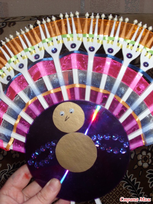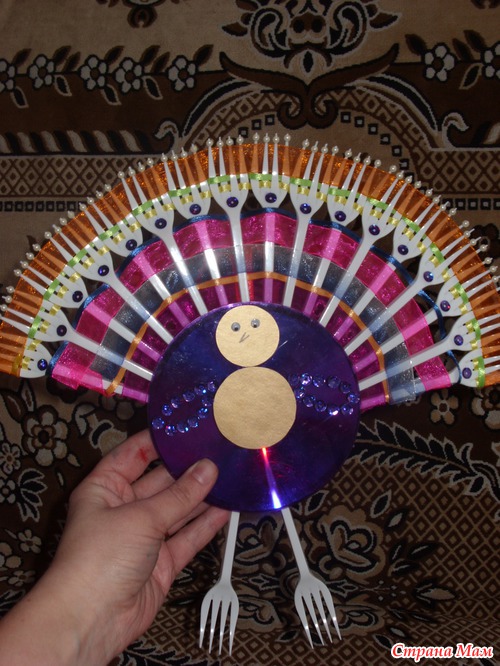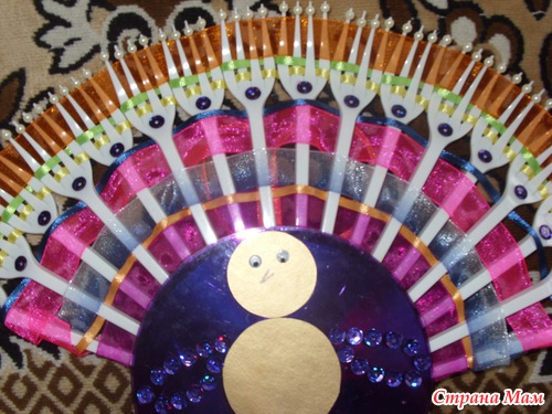 Вообще, прямо сказать, я не мастерица. Но очень хотелось сделать что то интересное и красивое. На просторах интернета нашла павлина из вилочек одноразовых. Уж очень он мне понравился!!! Спасибо создателям за идею.