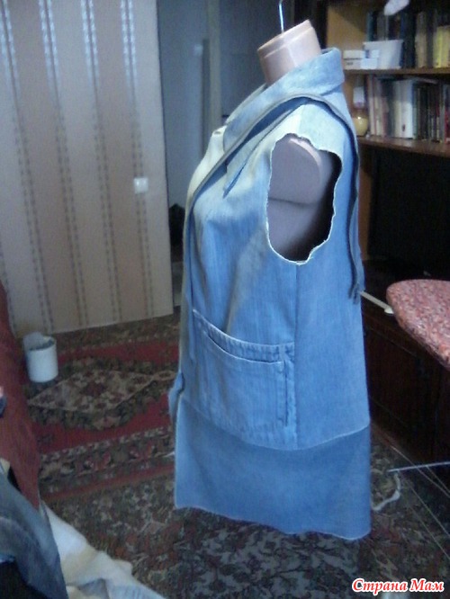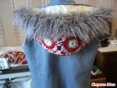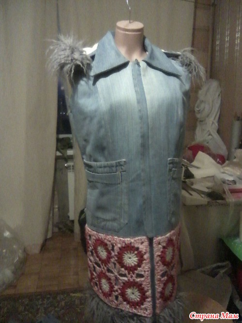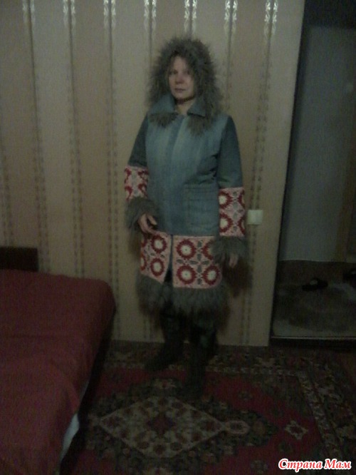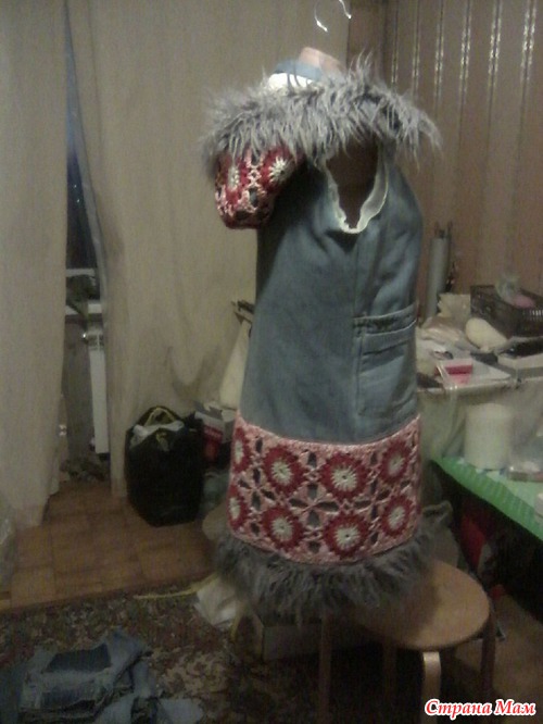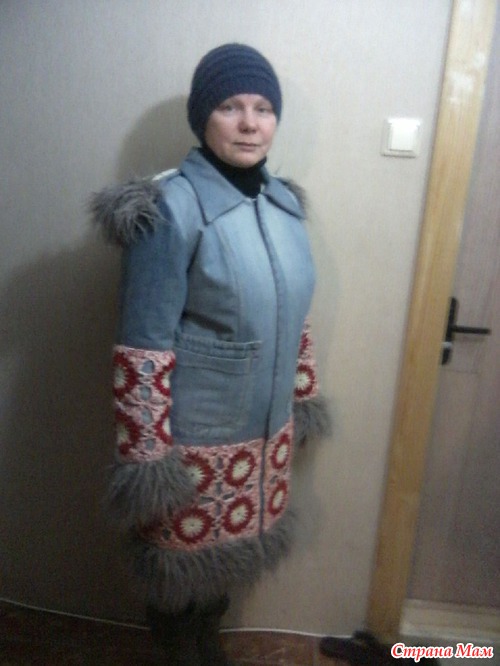 Вот такое пальто у маня получилось из 4-х пар старых джинсов и вязанных элементов