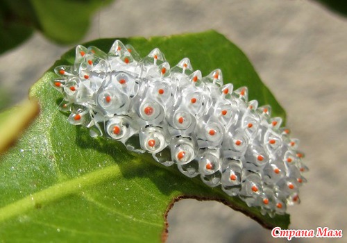 Верится с трудом, но эта похожая на драгоценный камень гусеница, мирно отдыхающая на сочном листе мангрового дерева, очень быстро превратится в яркую моль — дальцериду, все туловище которой покрыто огромным количеством оранжевых ворсинок.
