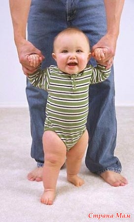 Если малыш свободно ходит, лишь слегка придерживаясь, а тем более отпускает опору и делает один-два шага самостоятельно, можно ему помочь овладеть ходьбой. Понятна радость родителей, когда их маленький сын или дочка первый раз делает три-четыре шага совсем самостоятельно. Если ребенок покачнется, теряя равновесие, надо мягким движением его подхватить, но не вскрикивать, чтобы не напугать его. Вскоре ребенок начнет сам, без всяких побуждений, самостоятельно ходить и будет быстро совершенствоваться в этом умении.
