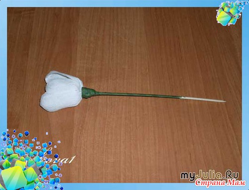 Приклеиваем свёрнутые лепестки к зубочистке и декорируем зелёной лентой.
