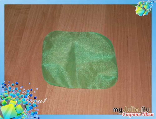 Чуть не забыли про листики. Листья мы изготавливаем из зелёной органзы. Для этого вырезаем квадрат 15х15 см. Края надо сделать круглыми.