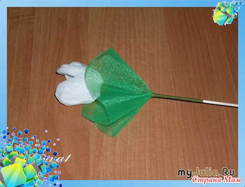 Заготовку из зелёной органзы протыкаем в середине зубочисткой и на необходимой высоте закрепить цветной лентой.