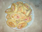 Выложила на противень, выпекала в течении 10-15 минут, после этого аккуратно перевернула на другую сторону (тут могут возникнуть небольшие сложности - некоторые "улиточки" из-за наличия сыра прилипали к бумаге, но ничего страшного), подрумянить с другой стороны минут 10. Все готово, можно кушать, мы съели моментально! Вот конечный результат:
