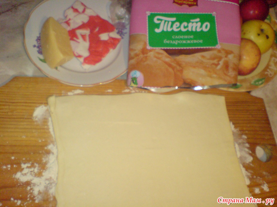 Затем подумала, что нужно сделать что-то вкусное и быстрое, например, закуску...Достала слоеное бездрожжевое тесто, крабовые палочки и сыр.