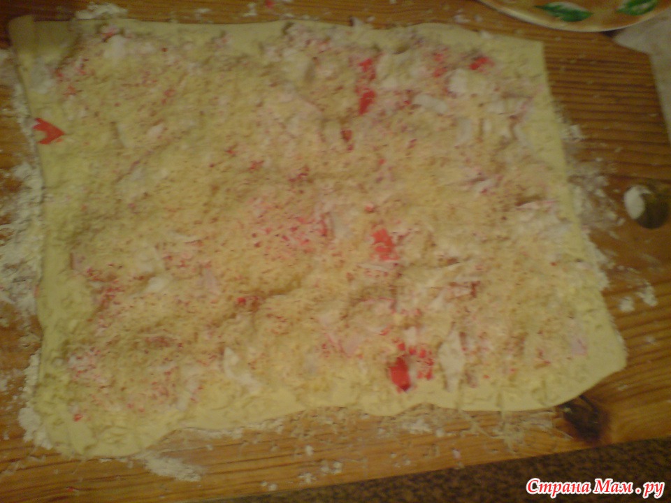 Тесто разморозила, раскатала в более тонкий пласт, сверху натерла крабовые палочки и сыр.