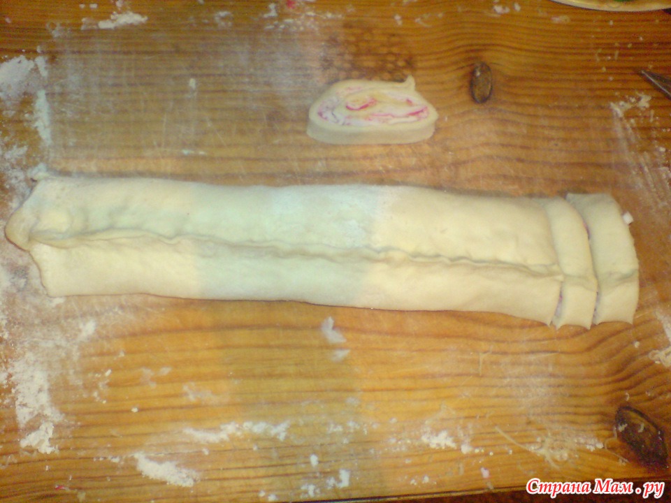 Свернула рулетом (шов нужно скрепить, как у пельменей, чтобы не развернулся рулет), и порезала на небольшие кусочки.