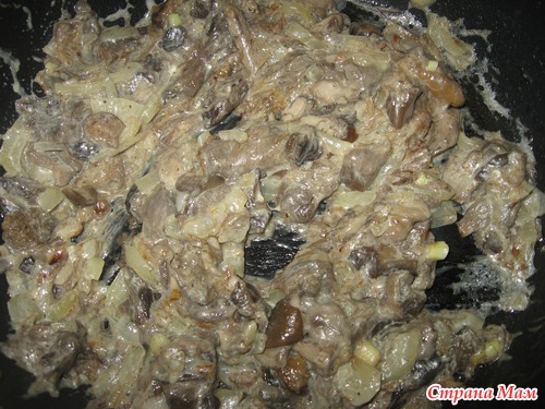 2 средние луковицы порезать четвертинками и пару минут потушить под крышкой.. добавить грибы (у меня вареные замороженые).. посолить, приправить.. обжарить пару минут и добавить 2 ст. ложки сметаны (если есть сливки, то сливки) и потушить до загустения... добавить зелень и слегка остудить...