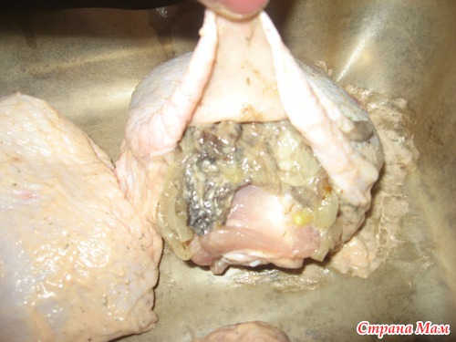 На бедрышке приподнять кожицу, но не до конца.. противоположный край должен остаться с мясом..