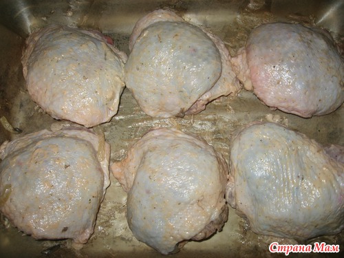 Куриные бедрышки посолить, приправить и замариновать в смеси майонеза и кетчупа.. пускай полежат, хотя бы, часика 1,5-2...