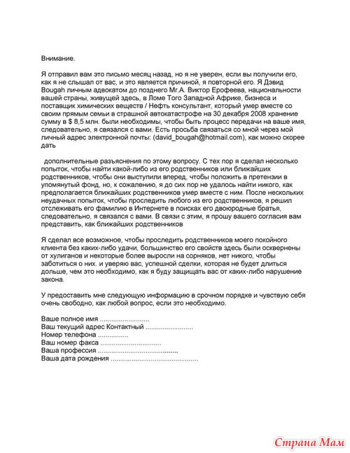 мне не приходят, а мужу приходит постоянно, что какой-то умерший дяденька из Германии является его дальним родственником и оставил ему наследство в несколько миллионов евро