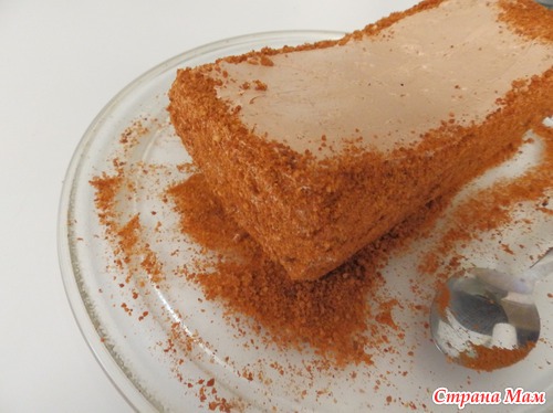 Коричневым кремом промазать верх и бока. Бока также обсыпать крошкой