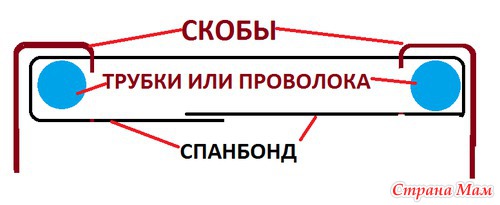 Спанбонд легкий материал. Чтобы его закрепить на земле, внутрь укладываю и проволоку и трубки затем, чтобы дополнительно создать арматуру, которую закрепляю скобами. См рисунок.