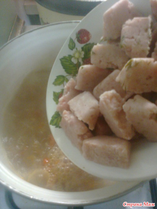 В кастрюлю наливаем воду(у меня родниковая), добавляем суповую заправкуhttps://www.stranamam.ru/post/5076260/ Доводим до кипения и в кипящую воду выкладываем замороженные фрикадельки.
