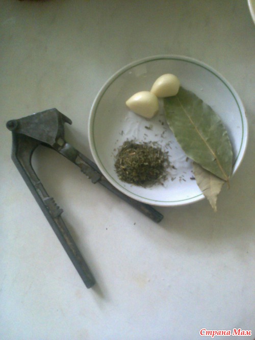 Кладем 1-2 ч л сахара,2 лавровых листика и чесночок, через чеснокодавилку, сушеную зелень(у меня укроп и зел. лук), перец молотый. Довели до кипения и убираем с плиты кастрюльку, чтоб цвет "не ушёл".