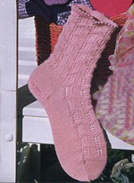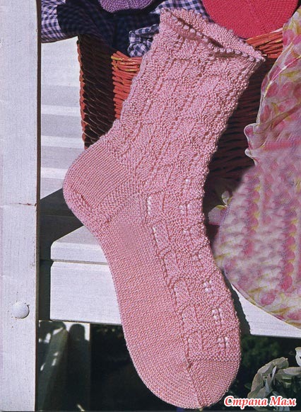 После пятки вязать петли 1-й и 4-й спиц лиц. гладью, петли 2-й и 3-й спиц - ажурным узором. Через 20 см от середины пятки начать вязать мысок, при этом для убавлений провязывать 3-ю и 2-ю от конца петли 1-й и 3-й спиц вместе лиц. скрещ. и 2-ю и 3-ю п. 2-й и 4-й спиц - вместе лиц.