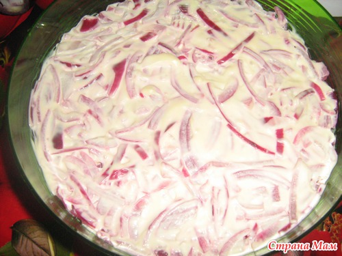 Салат делается слоями: 1-й слой порезанный кубиком окорочок, майонез, 2-й слой тертый на крупной терке картофель, майонез. Лук режем полукольцами заливаем сначала кипятком на 5 минут, а за тем маринуем (в тарелку с луком добавляем воды и чуть-чуть уксуса. Я всегда пробую, должно быть в меру кисленько) даем немного настояться, затем сливаем воду, как стечет укладываем на картофель и смазываем майонезом. Поставить в холодильник на несколько часов что бы пропитался салат и можно кушать. Получается просто класс!!!