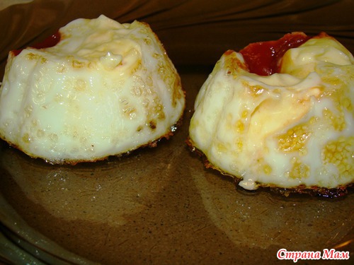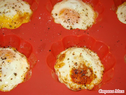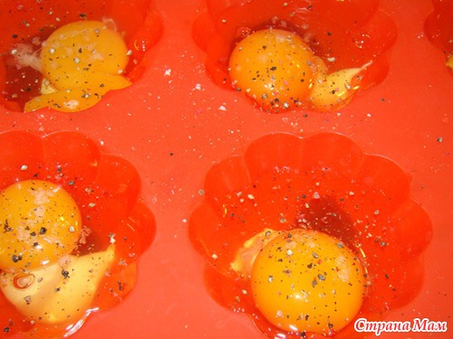 Вбить по одному яйцу, посолить, поперчить и поставить в духовку при 200 *. печь до любой твердости яйца. Как вы хотите или в смятку или крутое яйцо
