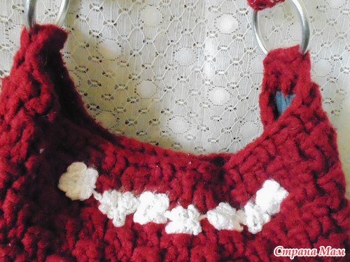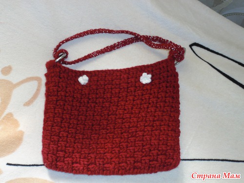 подождать. Пришлось забирать сумочку и везти к постороннему человеку, который справился за 2 дня.Итак "Зимняя сумка". Маленькая - по длине помещается кошелек и в высоту с тетрадку, примерно. Но она мне очень нравится, потому как не смотрела никакие схемы, просто вязала. Беленькие цветочки закрывают магнитные кнопки.