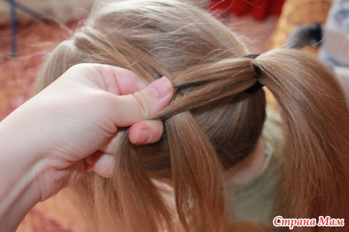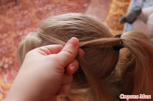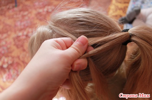 Теперь еще одну из хвостика, что бы получилось три прядки: