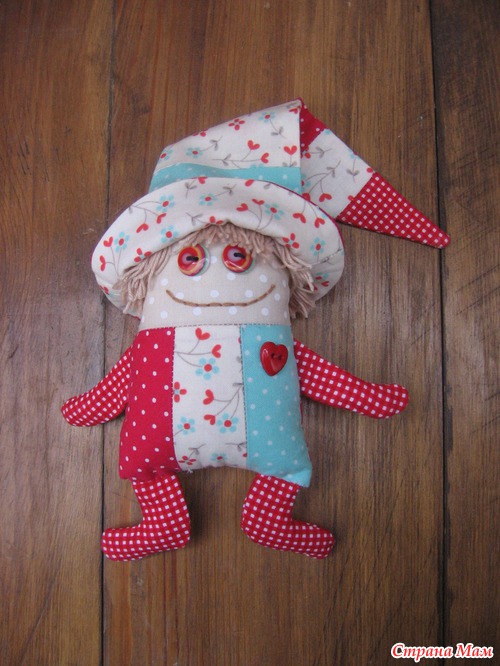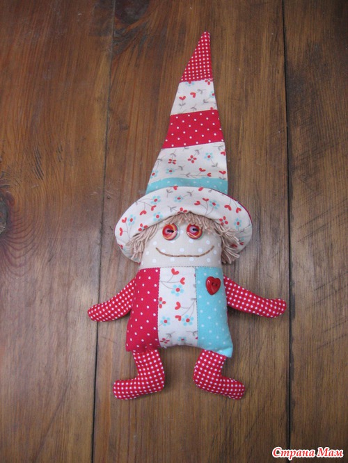 Решила пошить яркого весёлого человечка. Американский хлопок, наполнитель холлофайбер, гранулят (ножки, ручки)-обычный бисер. Внутри игрушки два бубенца. Высота человечка без колпачка 15 см.