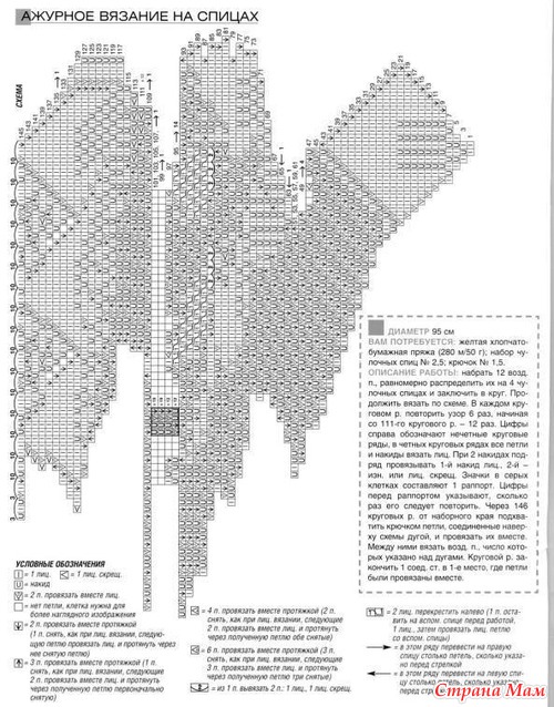 Цифры справа обозначают нечетные круговые ряды, в четных круговых рядах все петли и накиды вязать лиц. При 2 накидах подряд провязывать 1-й накид лиц. 2-й изн. или лиц скрещ.