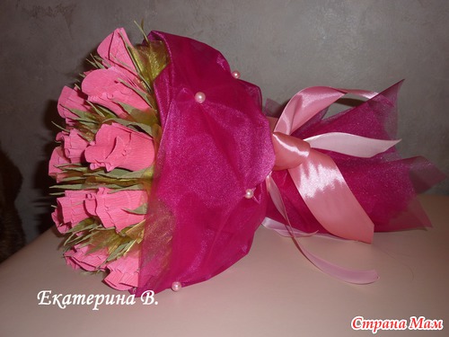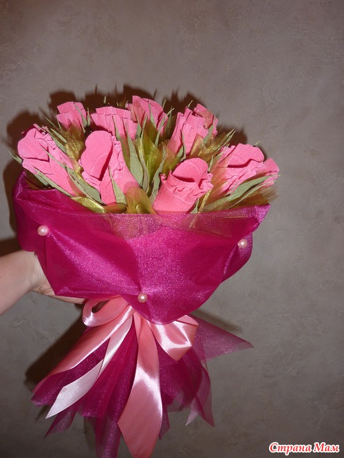 Занимаюсь букетами и композициями больше года, но оформить букет с помощью органзы решилась только сегодня... как говорится "первый блин", но думаю, что не "комом"... не судите строго...