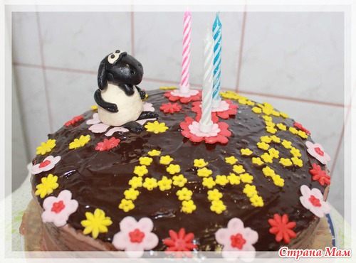 На тортик с Тимми было пару часов, поэтому полила шоколадом и... посадила Барана. Внутри 2 порции Захера прослойка вишни и сметанный крем с какао