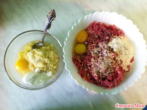 Сделать фарш, промолоть в мясорубке белый хлеб, лук и чеснок вместе с мясом добавить 2 яйца 2 ст. л. муки, соль по вкусу, немножко трав-приправ еще добавила. Посолить по вкусу.