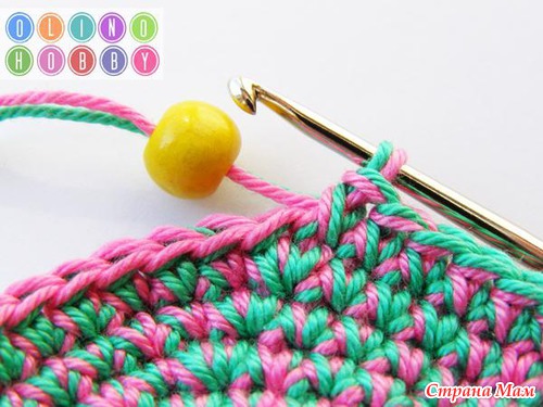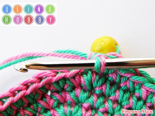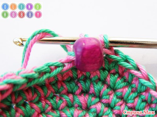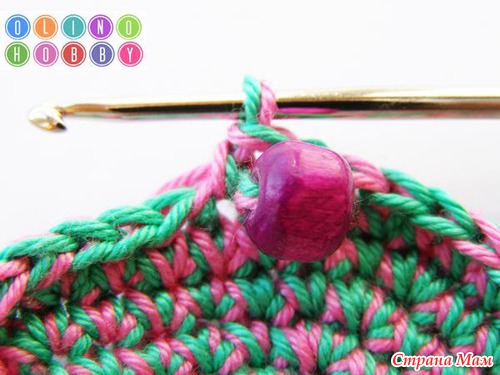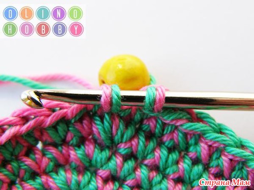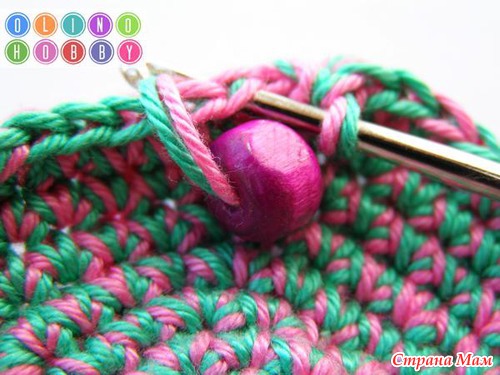 Теперь о бусинах. Бусины ввязываются в процессе вязания самого мячика. Вот вы дошли до места Х - где будет первая бусина, допустим это на этапе прибавления 3 круговой ряд. Подтяните бусину поближе к крючку: