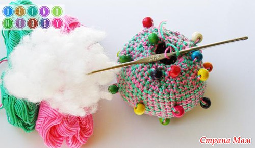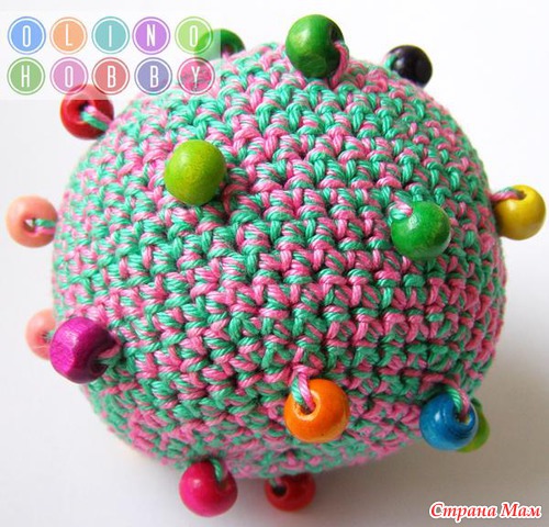 Вяжем мячик, в процессе не забывая про бусины. Далее отдельно описание мячика и как ввязать в него бусины. Эти два этапа нужно делать одновременно.