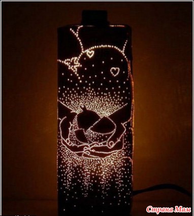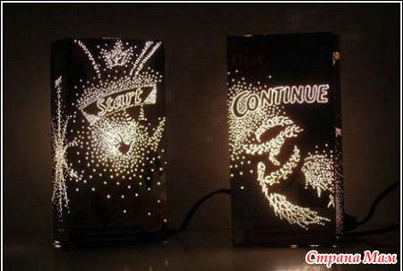 Причем, вы можете быть абсолютно уверены, что во всем мире не найдется больше такого светильника, как у вас. Не смотря на всю простоту его изготовления, каждый из таких светильников уникальный. Ведь его творец сам выбирает, где он проколет упаковку, и откуда в итоге будет литься свет.