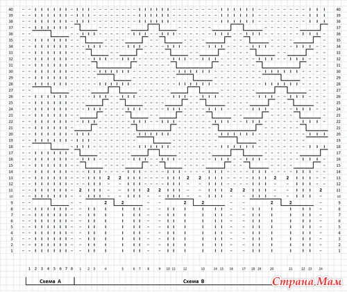6. Следующие 40 рядов провязать по рисунку 1, при этом на 8 раппортах (косах) необходимо вязать по схеме A, на оставшихся 6 раппортах - по схеме B (передняя часть корсета)