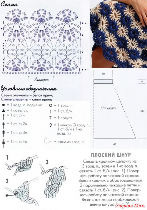 Описание: Крючком №10 синей пряжей набрать 16 раппортов и вязать круговыми рядами основным узором по схеме< уменьшая номер крючка через каждые 10-11 см. Через 56 см от начала работы, связать для пояса синей пряжей 6 р. ст. б/н, 1 р. каймы (*3 возд. п., пропустить 3 п., 1 ст. б/н, повторять от *).