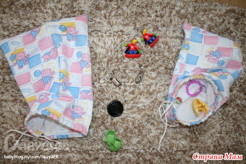 Для занятия нам потребуются 2 одинаковых мешочка. Свои я сшила за 15 минут из штанин ненужной детской пижамы. Внутрь мешочков накидываем разные мелочи, но так чтобы они повторялись (маленькая игрушка, прищепка, застежки, шарик и т. п.). Малыш достает из мешочка приятные мелочи и раскладывает по парочкам. Варианты занятия могут быть различными. Запускать руку в мешочек и угадывать предмет на ощупь, доставать предметы по определенным свойствам (круглые, шершавые...), доставать предметы на определенную букву и т. д.