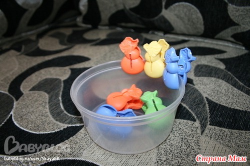 Занятие с прищепками очень хорошо тренирует захват тремя пальцами. Самый простой вариант - сложить прищепки в емкость и предложить ребенку доставать и крепить прищепки по краю этой емкости. Или натянуть шнур между стульями и крепить прищепки на него. Усложняя задачу, к шнуру прищепками крепим яблочки, листики из картона или настоящие носочки, перчатки, платочки.