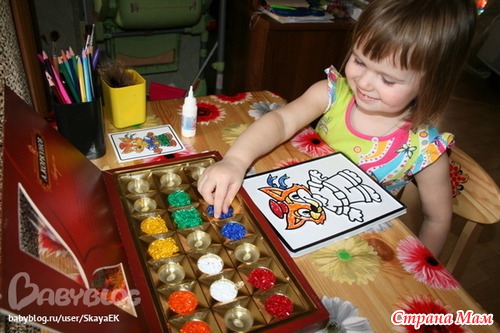 Я уже писала про аппликацию из круп и макарон. Можно это занятие сделать еще красочнее. Оказывается бывают в продаже готовые комплекты "Насыпь - наклей". Картину на материале типа пенопласта надо в соответствии с картинкой обклеивать "бусиками" (не знаю как правильно назвать этот материал, но похоже на бисер, только без дырок).